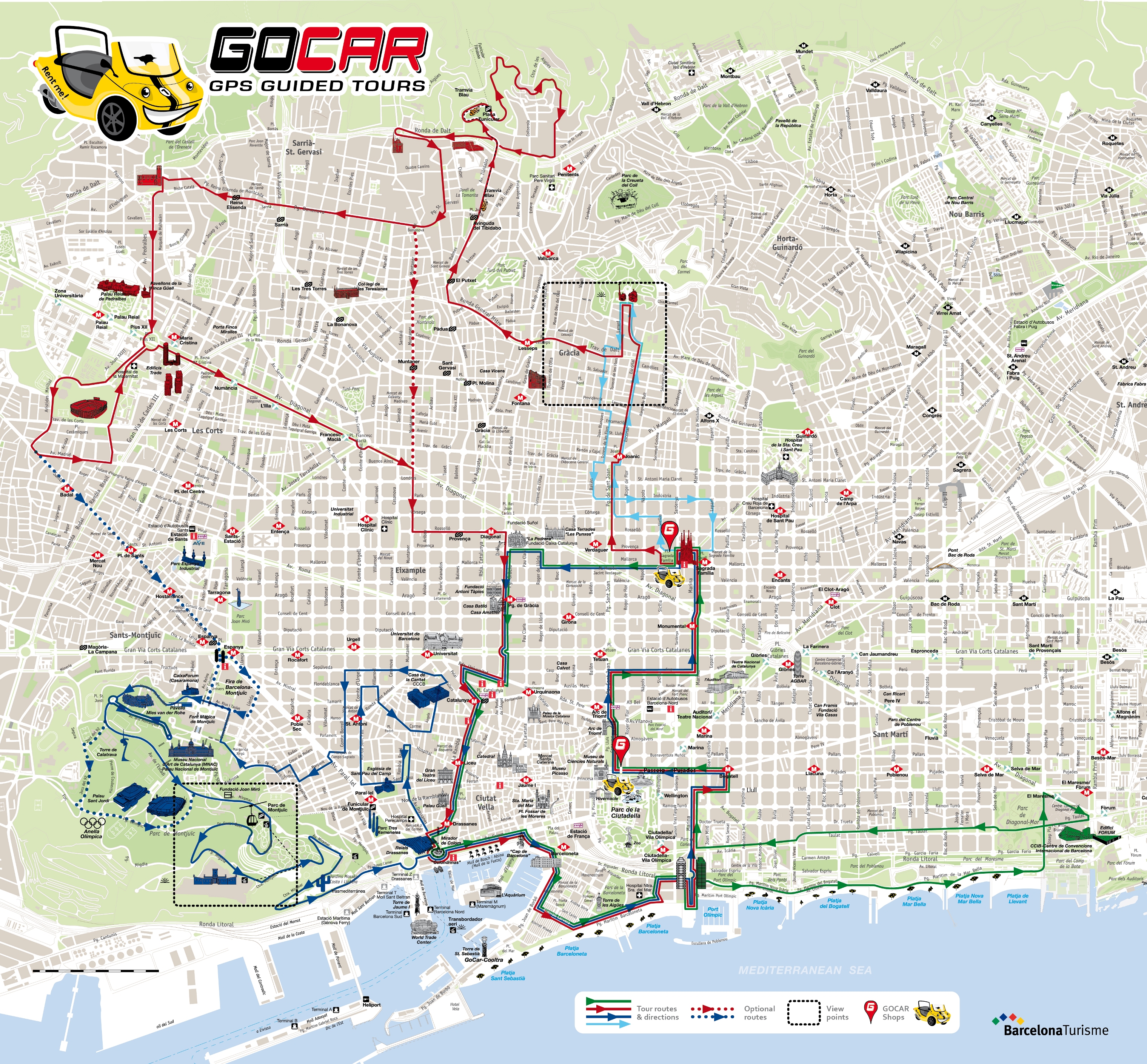 Arc de Triomf - Sagrada Familia - Gracia - Parc Guell - Tibidabo - Torre Bellesguard - Sarria - Pedralbes Monastery - Dragon's Gate - Guell Pavilions - FC Barcelona - Diagonal - La Pedrera - Casa Battlo - Placa Catalunya - Las Ramblas - Palau Guell - El Raval - M.A.C.B.A. - Placa Sortidor - Greek Theatre - M.N.A.C. - Poble Espanyol - Olympic Stadium - Olympic Museum - Miro Foundation - Montjuic Castle - Port Vell - History of Catalonia Museum - Barceloneta - Port Olympic - Mar Bella - Diagonal Mar - Forum - Telefonica Tower - Museu Blau - Poble Nou Cementary - Park Ciutatdella